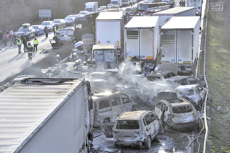 Polis menyatakan kemalangan yang melibatkan lima buah treler dan 37 kenderaan lain berlaku di lebuh raya M1 kira-kira 25 kilometer barat Budapest, ibu negara Hungary.