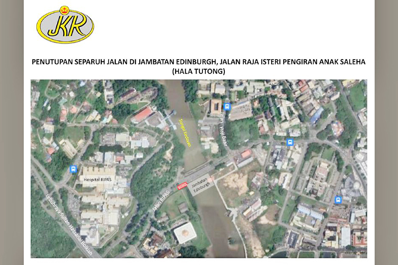 BANDAR SERI BEGAWAN, 12 JULAI – Jabatan Kerja Raya (JKR), Kementerian Pembangunan memaklumkan orang ramai terutamanya para pengguna jalan raya mengenai penutupan sementara separuh jalan di Jambatan Edinburgh, Jalan Raja Isteri Pengiran Anak Saleha (hala Tutong) bermula hari ini hingga 14 Julai.