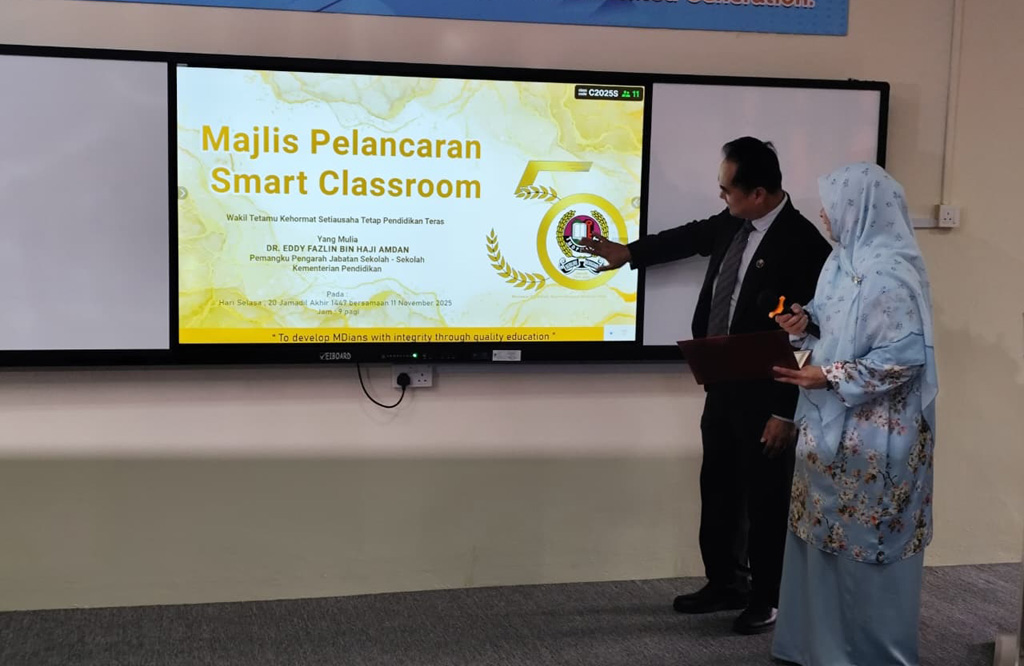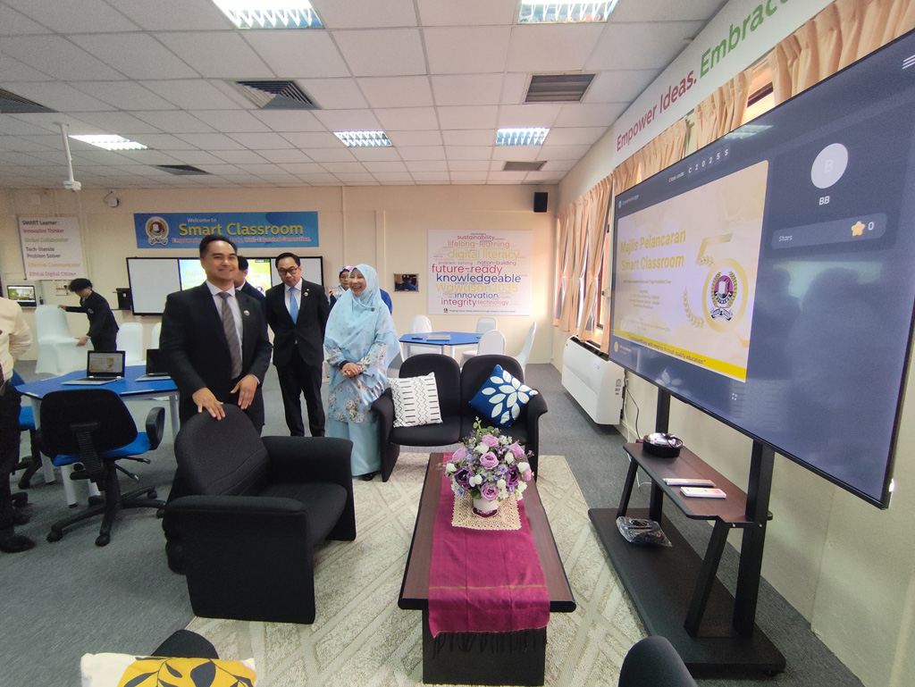Hadir untuk menyempurnakan pelancaran Smart Classroom berkenaan, Pemangku Pengarah Jabatan Sekolah-Sekolah, Dr Eddy Fazlin bin Haji Amdan yang mewakili Setiausaha Tetap (Pendidikan Teras), Kementerian Pendidikan, Dr Shamsiah Zuraini Kanchanawati binti Haji Tajuddin.