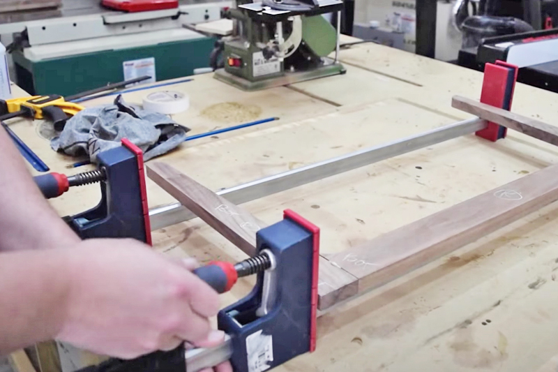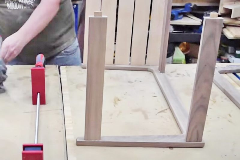 Mulakan dengan mencantumkan kaki meja dan kayu bahagian atas dan bawah. Sapukan permukaan cantuman dan isikan ruangan pasak dengan gam kayu. Kekalkan kedudukannya sehingga gam mengering menggunakan gam kayu sebelum membolehkan awda meneruskan langkah mencantumkannya dengan bahagian lain. (Gambar 10)
