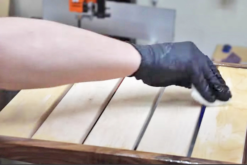 Sebagai langkah terakhir, setelah gam mengering, keseluruhan permukaan kayu akan disapukan dengan wood finish pilihan untuk melindungi rekaan. Sekurang-kurangnya dua lapisan diperlukan dengan memberikan masa untuknya menyerap sebelum menyapukan lapisan seterusnya.