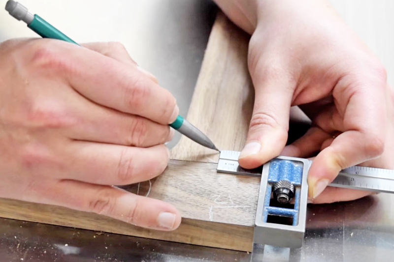 Bagi mengukuhkan cantuman rekaan, bahagian tengah sudut cantuman akan ditebuk untuk ruangan kayu pasak dimasukkan. Untuk menetapkan kedudukannya, cantumkan sementara setiap bahagian dan tandakan menggunakan pensel. (Gambar 6)