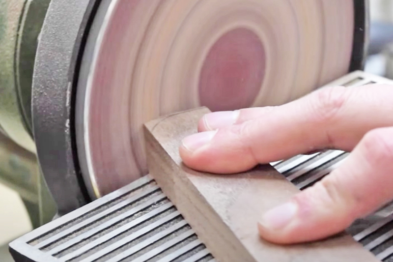 Bahagian hujung kayu untuk atas dan bawah yang berukuran 2 inci akan dibulatkan sudut luarnya menggunakan mesin kertas pasir dengan ukuran 80 grit. Selain itu keseluruhan permukaan kayu juga akan dihaluskan dengan cara menggosoknya menggunakan kertas pasir berukuran 400 grit. (Gambar 8)