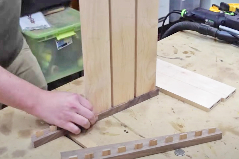 Selain itu bahagian dalamnya pula akan direka dengan ruangan untuk memasukkan pasak kayu untuk kelima-lima batang kayu 4¼ x 12 x ¾ inci. Lakukan langkah yang sama seperti sebelumnya untuk menetapkan kedudukan serta menebuk ruang bagi pasak. (Gambar 9)