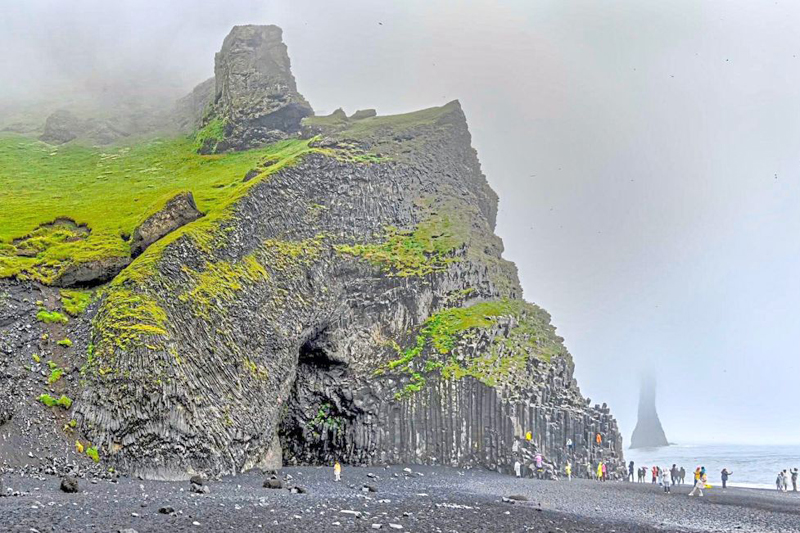 Di Reynisfjara, pantai pasir hitam terbentang ke ufuk, gunung berapinya berkilauan.