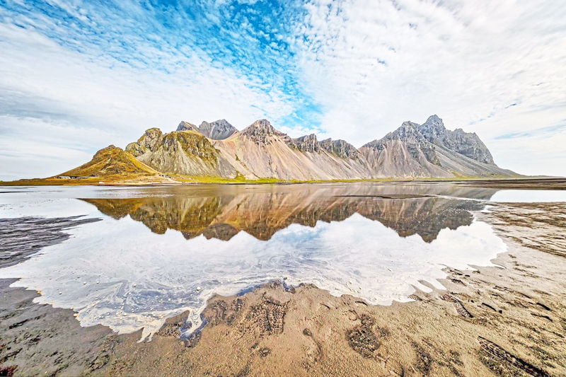 Lebih jauh ke hadapan, Vestrahorn menjulang ibarah belakang naga daripada batu gelap yang berlatarkan langit yang sentiasa berubah.