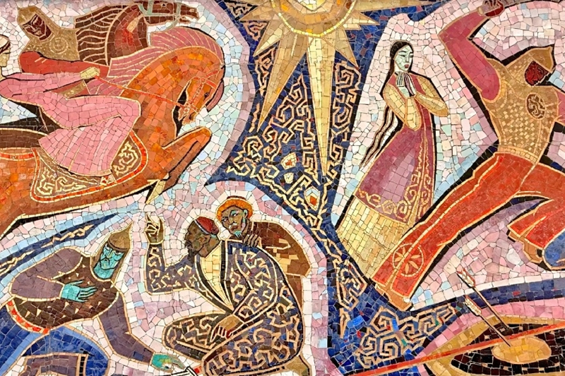 Di dinding kiri terpampang mozek Enlik-Kebek yang dihasilkan pada 1965, memaparkan kisah cinta tragis sepasang kekasih Kazakh yang ditakdirkan berpisah, mengimbau tragedi Romeo dan Juliet.