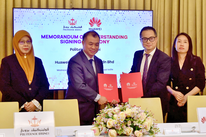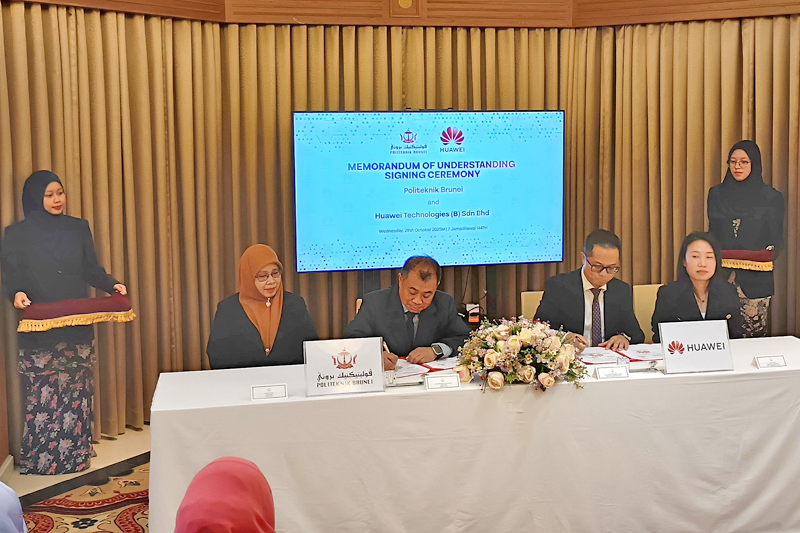 BANDAR SERI BEGAWAN, 29 OKT – Bagi memperkukuhkan hubungan dalam bidang penyelidikan, pendidikan serta program latihan dalam bidang Teknologi Maklumat dan Komunikasi (ICT), Politeknik Brunei (PB) dan Huawei Technologies (B) Sdn Bhd menandatangani memorandum persefahaman (MoU) yang berlangsung di Kampus Ong Sum Ping, PB, Bandar Seri Begawan, hari ini.