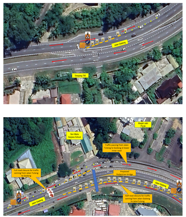 Penutupan jalan berkenaan adalah untuk membolehkan kerja-kerja pemasangan atap jejantas berdepanan Masjid Jubli Perak untuk dilaksanakan.