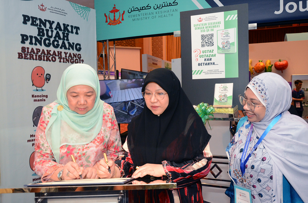 Di majlis itu, tetamu Kehormat turut mengunjungi kawasan pameran dan melancarkan buku “Ustaz… Ustazah… Kan Betanya…”, terbitan Jabatan Perkhidmatan Renal, Kementerian Kesihatan melalui Khidmat Ugama, bersama Pengarah Urusan Perbadanan Tabung Amanah Islam Brunei (TAIB), Hajah Rohani binti Haji Abdullah.
