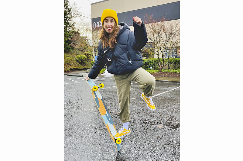 Hannah Dooling meluncur di atas permukaan jalan, fon telinga tersembunyi di bawah rambut coklat panjang yang terselit di bawah topi besbol. Dia melangkah dari papan panjangnya, membaliknya separuh bulatan di udara sambil mengambil beberapa langkah berlari, dan melompat kembali ke papan itu, mendarat dengan bunyi dentuman yang bergema.