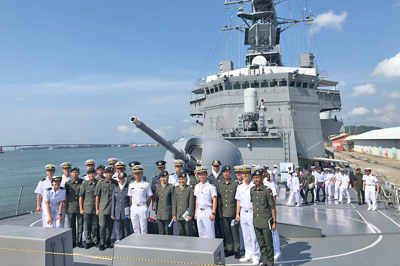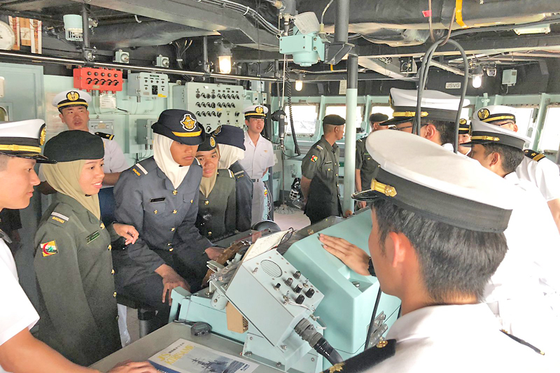 BANDAR SERI BEGAWAN, 10 APRIL – Pegawai-pegawai kadet Angkatan Bersenjata Diraja Brunei (ABDB) berpeluang untuk mengenali dan diberikan penerangan mengenai kapal Angkatan Maritim Pertahanan Diri Jepun (JMSDF), JS KIRISAME, semasa lawatan ke atas kapal berkenaan di Pelabuhan Muara, hari ini.