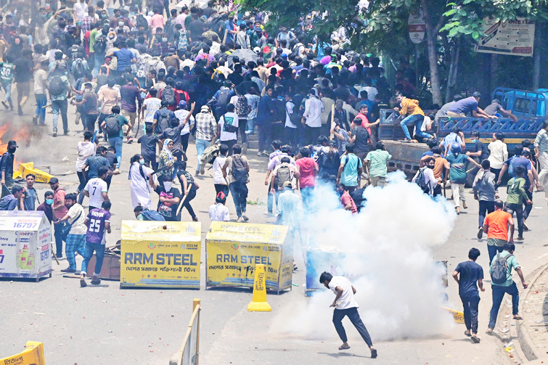 Polis melepaskan gas pemedih mata dan peluru getah bagi menyuraikan penunjuk perasaan, manakala pelajar yang juga sekutu parti pemerintah Liga Awami bertempur di jalanan menggunakan batu-bata dan batang buluh.