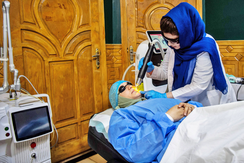 Di vila empat tingkat yang diubah suai menjadi klinik, kaedahnya sama seperti yang digunakan di luar negara dan ‘tidak menimbulkan risiko,’ kata Abdul Nassim Sadiqi, pakar dermatologi. Di kliniknya, Botox berharga AS$43 hingga 87 dan AS$260 hingga 509 untuk implan rambut.