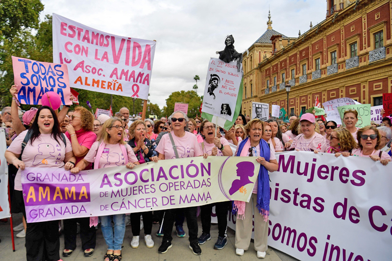 Mengikut seruan AMAMA, sebuah persatuan wanita penghidap kanser payudara yang berpangkalan di Seville menjalankan protes tunjuk perasaan di hadapan Istana San Telmo, pusat pentadbiran wilayah tersebut. – AFP
