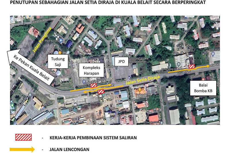 BANDAR SERI BEGAWAN, 25 JUN – Jabatan Kerja Raya (JKR), Kementerian Pembangunan memaklumkan orang ramai terutamanya para pengguna jalan raya mengenai penutupan sementara sebahagian Jalan Setia Diraja, Kuala Belait secara berperingkat bermula esok pada pukul 9 pagi.