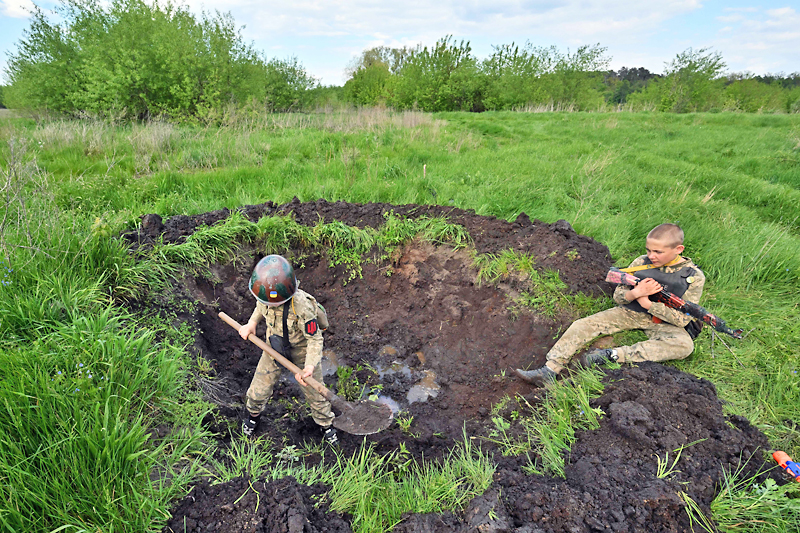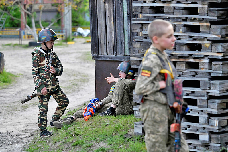 KYIV, UKRAINE – Kanak-kanak lelaki memakai topi keledar terpakai dan senjata mereka tidak dapat membunuh, tetapi aksi perang yang mereka mainkan di padang Ukraine yang hijau adalah nyata bagi mereka dan memberi kesan.