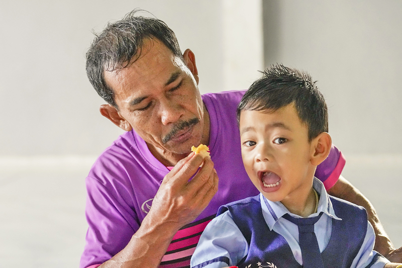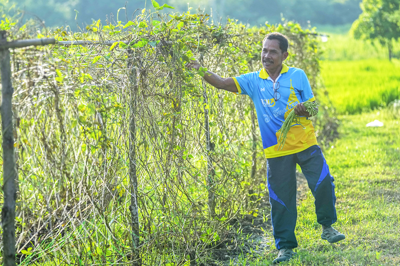 Di bawah sinar matahari pagi yang terik, dia membawa dua cucu lelakinya ke jalan utama untuk menunggu van sekolah mereka sebelum menjalani harinya, memetik sayur-sayuran dan mencabut rumput.