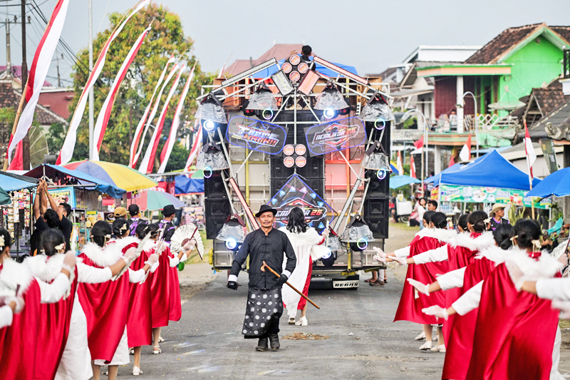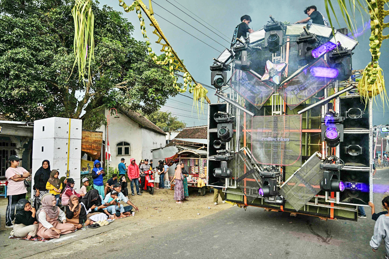 Pembesar suara sebegini sudah menjadi pemandangan biasa di pulau utama Jawa, memutarkan gabungan muzik elektronik berulang-ulang dan lagu rakyat tradisional pada pesta jalanan.