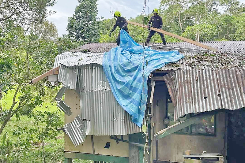 TEMBURONG, 15 OGOS – Sepohon pokok rambutan yang tumbang telah merosakkan sebahagian atap bilik tidur Rumah Bahagia Kampung Simbatang, Jalan Temada, kelmarin