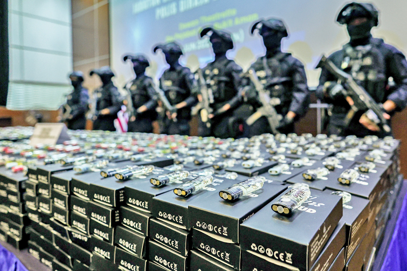 KUALA LUMPUR, 23 JUN – Cubaan satu sindiket antarabangsa menyeludup dadah jenis kokain dalam bentuk katrij vape melalui Malaysia terbongkar apabila polis berjaya menahan empat individu dan merampas hampir 5,000 katrij bernilai RM 7.2 juta dalam serbuan di Ampang Jaya, Khamis lepas.