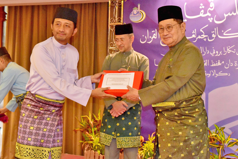 BANDAR SERI BEGAWAN, 14 SEPT – Haji Awang Zul-Hafiz bin Awang Tengah yang berjaya meraih tempat ketiga pada Majlis Tilawah dan Menghafaz Al-Quran Peringkat Antarabangsa ke-63 yang berlangsung di Kuala Lumpur, Malaysia, baru-baru ini, telah diraikan pada Majlis Penyampaian Skim Penggalak Kecemerlangan Membaca Al-Quran bagi Wakil Negara Brunei Darussalam di Hotel Antarabangsa Rizqun, Gadong, hari ini.