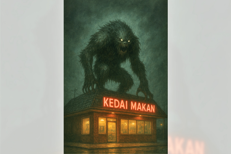“Aku pun pernah nampak benda yang sama masa aku seorang dekat situ,” katanya. Aku terkejut. “Benda sama? badannya besar, berdiri atas restoran?” Dia angguk.