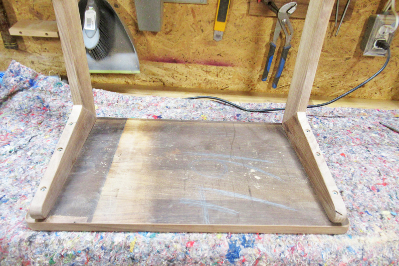 2. Letakkan permukaan meja menghadap bawah, ukur ¾ inci dari sisi pendek dan pasangkan kaki dengan skru dari bawah penyokong.