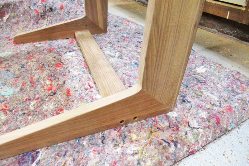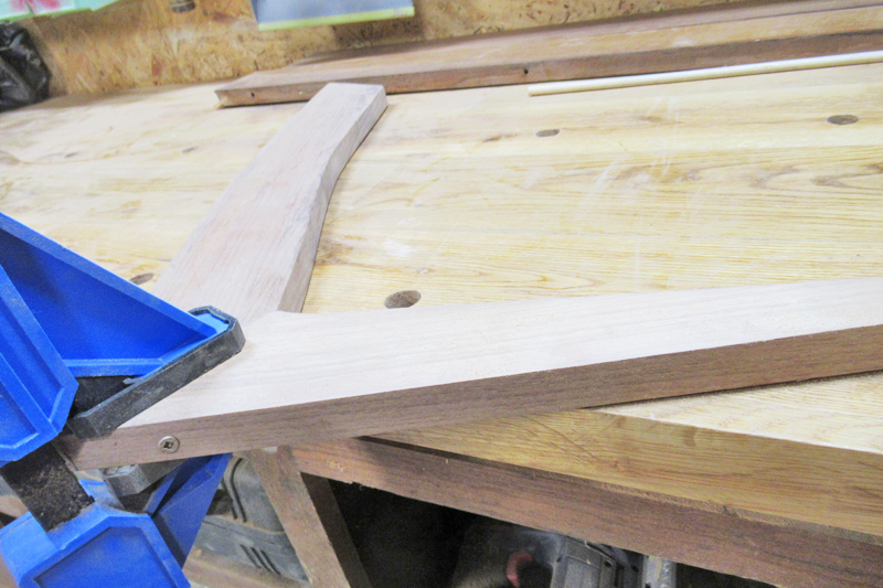 Kepit sudut 45 darjah penyokong dan kaki, kemudian skru bersama. Gerudi lubang ¼ atau 5/16 inci dari bahagian rata penyokong ke dalam kaki. Sapukan gam dan masukkan dowel kayu.