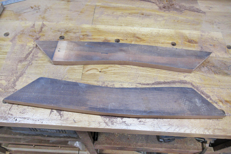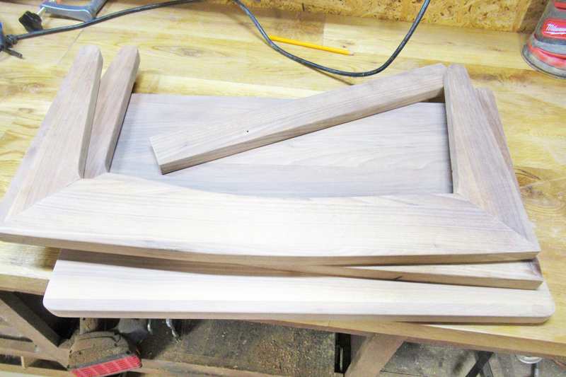 Bulatkan sudut permukaan meja menggunakan gergaji jig. Kaki tegak dibentuk melengkung: ukur ¾” di bahagian atas dan bawah untuk garisan luar, kemudian ulang di bahagian dalam.