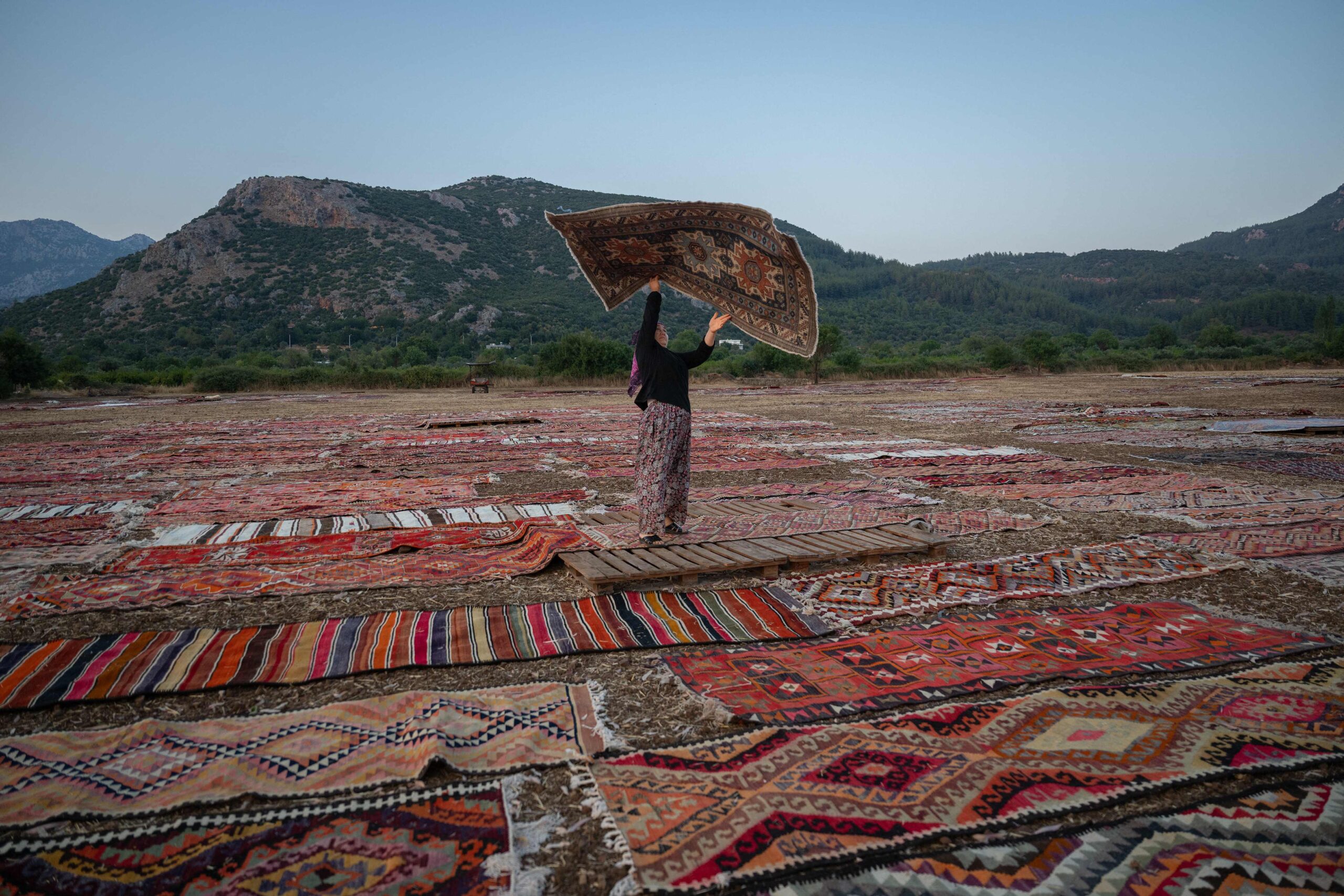 Dari bulan Jun hingga September, di kawasan ladang yang telah dituai dan dibersihkan, para peniaga membawa karpet-karpet mereka untuk “diperam” di bawah matahari – bagi memudarkan sedikit warna-warna semula jadi yang terang dan menghilangkan unsur-unsur yang tidak diingini.