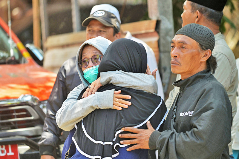 Di kawasan berhampiran, Dewi Sulistiana menunggu berita mengenai anak lelakinya yang berusia 14 tahun, yang terakhir dihubunginya pada Ahad. Sekolah asrama itu mengehadkan akses pelajar kepada telefon bimbit.