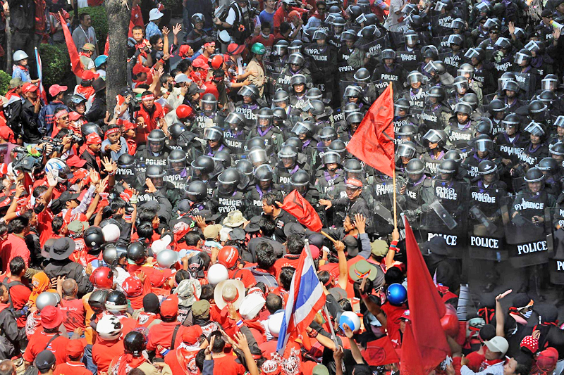Puluhan ribu penyokong ‘Baju Merah’, yang dikenali melalui warna pakaian mereka, menguasai beberapa persimpangan utama di ibu negara Bangkok pada tahun 2010, sebahagiannya berkubu di kem protes dan bertempur dengan pihak berkuasa.