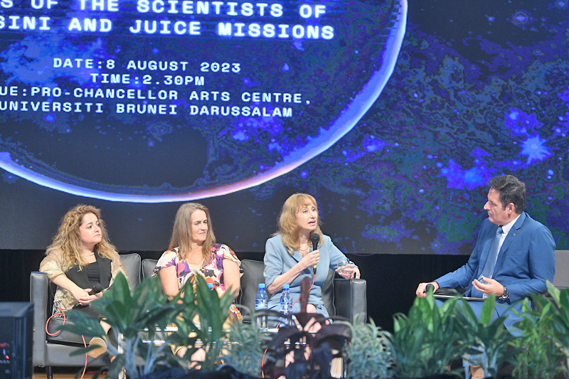 BANDAR SERI BEGAWAN, 8 OGOS – Para penggemar angkasa lepas, penyelidik dan pelajar telah berpeluang menimba pengetahuan menerusi ceramah umum bertajuk Shaping a Sustainable Future for Humanity: A Journey to Jupiter, Saturn and Their Moons Through the Eyes of the Scientists of Cassini and Juice Missions yang diadakan di Pusat Kesenian Pro Canselor, Universiti Brunei Darussalam (UBD), hari ini.