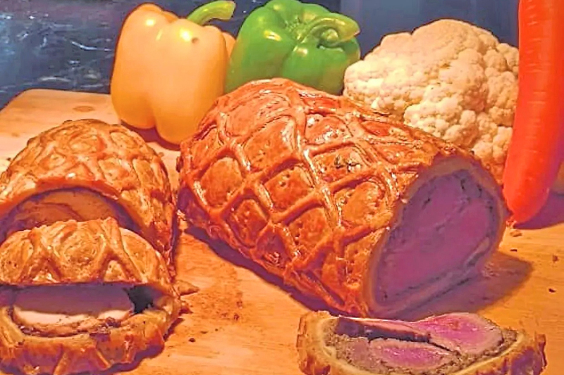 Daging Wellington klasik rangup di luar menyembunyikan daging yang lembut.