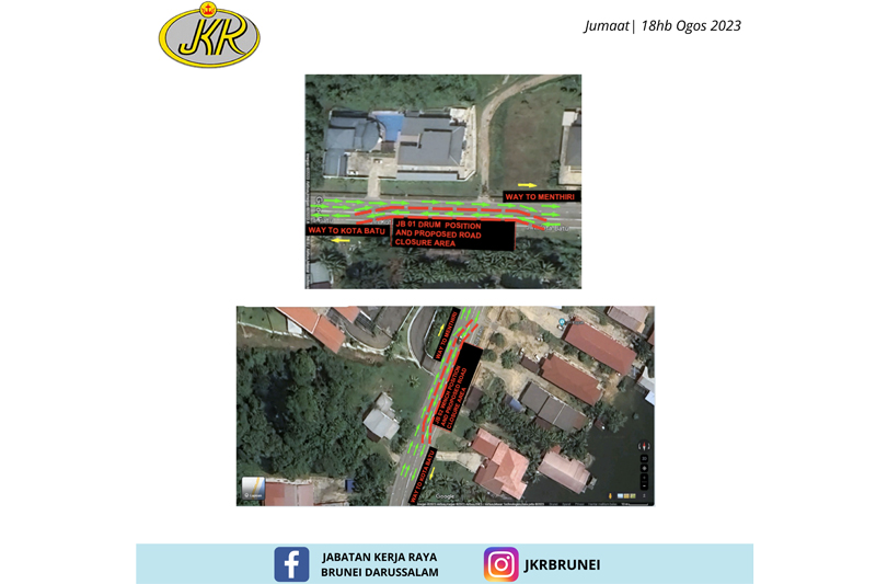BANDAR SERI BEGAWAN, 20 OGOS – Jabatan Kerja Raya (JKR) dalam kenyataannya memaklumkan penutupan sementara sebahagian jalan di empat buah lokasi di Daerah Brunei dan Muara.