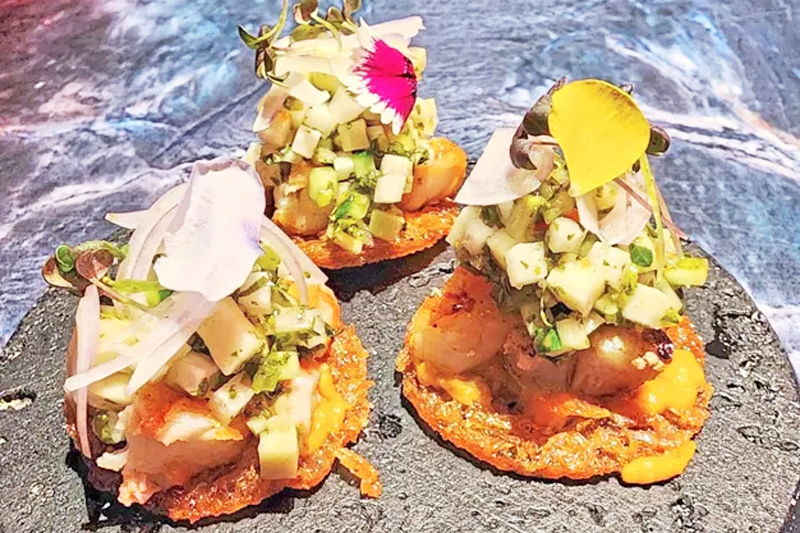 Roti bakar menyatukan semua rasa dan menambahkan lapisan bawah berair yang sangat menawan pada hidangan, yang kemudiannya diserikan oleh tobiko dan timun. Hidangan itu memancarkan suasana segar yang memberikan rasa sangat berperisa.