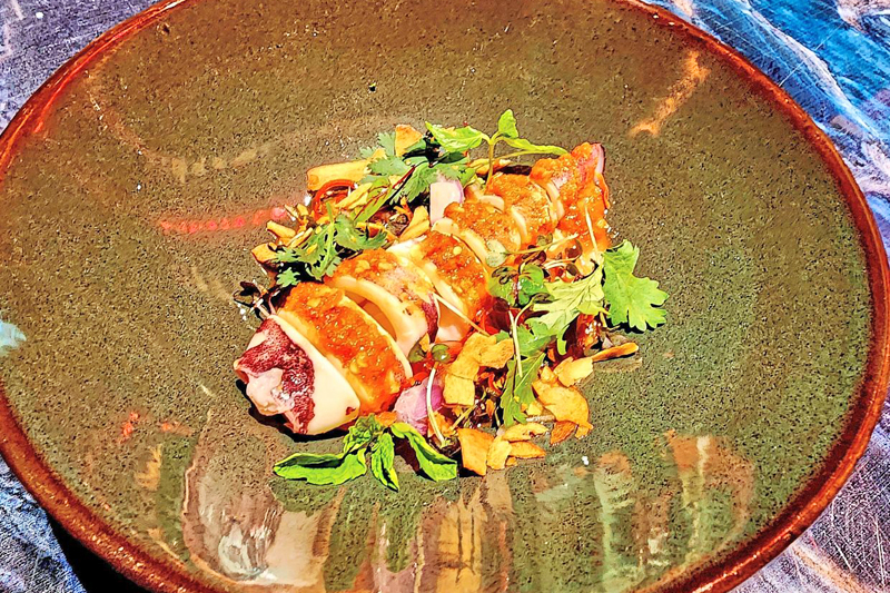 Kemudian terdapat sotong kukus dengan sos makanan laut merah. Seperti mana namanya, ia diperbuat daripada sotong kukus yang disalut dengan sos merah pedas.