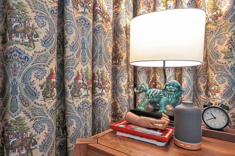 Kualiti dinamik itu berterusan di kawasan bilik tidur utama, dengan tona neutral dan lantai kayu hangat yang seimbang dengan langsir bercetak paisley-and-horse yang unik.