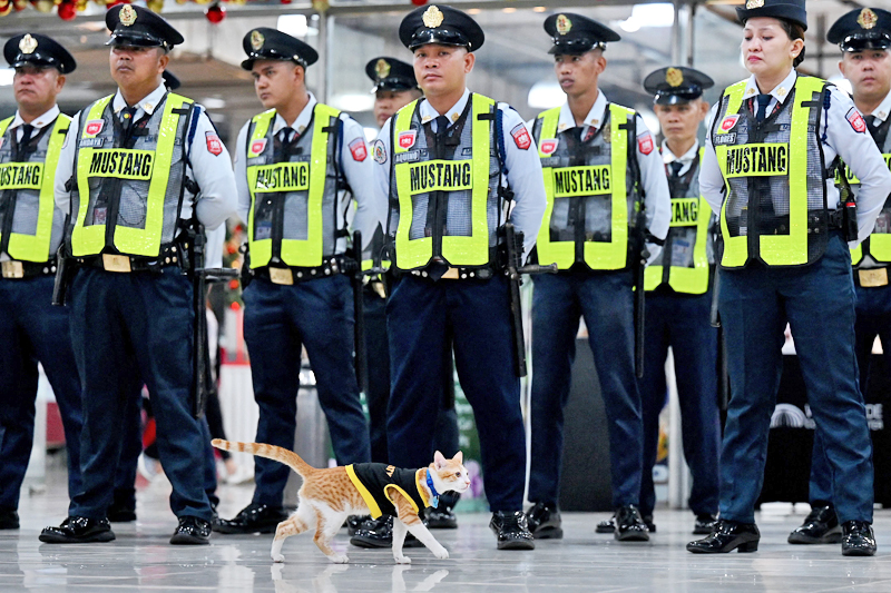 MANILA – Seekor kucing yang memakai jaket keselamatan warna hitam-kuning berjalan-jalan dengan santai melewati pengawal keselamatan yang berbaris di luar bangunan pejabat Filipina menunggu untuk menerima arahan bagi giliran kerjanya.