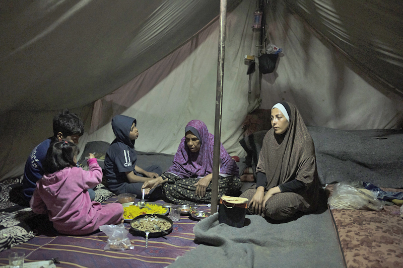 MUWASI, SEMENANJUNG GAZA – Pemandangan suram ketika Randa Baker dan keluarganya duduk di atas tanah di khemah mereka di selatan Gaza pada waktu matahari terbenam untuk menjamu selera berbuka puasa pada hari pertama di bulan Ramadan yang mulia.
