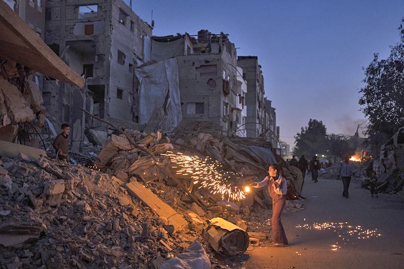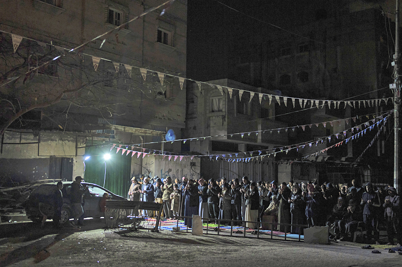 Di sebuah sekolah yang dipenuhi dengan pelarian di Rafah, seorang penyanyi memimpin kanak-kanak menyanyikan lagu Ramadan. Pada sebelah malam, jemaah berkumpul di sekitar runtuhan masjid untuk menunaikan tarawih.