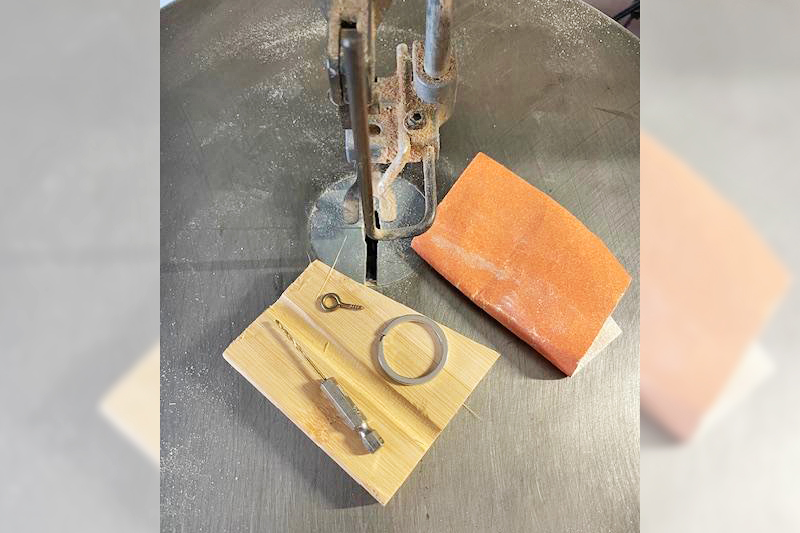 Gerudi lubang kecil di hujung yang bertentangan dengan takikan untuk memasang skru bermata cangkuk.