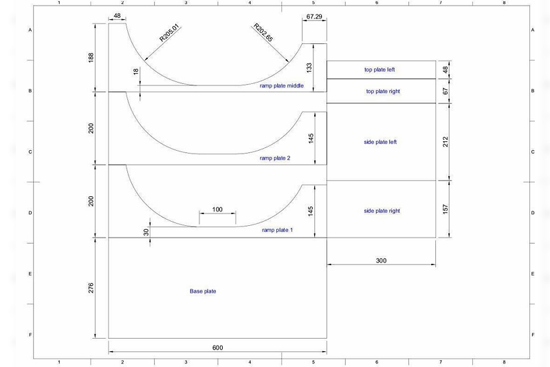 Tanjakan fingerboard ini terdiri daripada lapan bahagian iaitu rangka tanjakan tengah, kiri, kanan, bahagian bawah, penutup bahagian sisi kiri, kanan dan bahagian penutup atas kiri dan kanan. Kayu setiap bahagian terbuat daripada papan lapis mempunyai panjang 60cm, dengan tinggi 20cm berbalas 14.5 (rangka sisi kanan dan kiri), 18.8cm berbalas 13.3 (rangka tengah), dan lebar 27.6cm untuk bahagian bawah. Manakala kayu bahagian sisi kiri mempunyai lebar berukuran 21.2cm, sisi kanan (15.7cm), atas kanan (6.7cm) dan atas kiri 4.8cm dengan kesemuanya mempunyai panjang 30cm. (gambar 2)