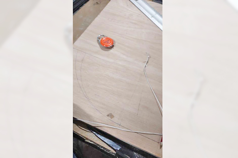 Lakar ukuran diperlukan pada permukaan kayu menggunakan pensel. Rangka utama pada bahagian tengah yang merata mempunyai panjang 10cm. Sementara bahagian dalam kedua-dua kiri dan kanan akan dibentuk separa bulatan. Bagi memudahkan langkah membentuk separa bulatan, gunakan tali yang diikat hujungnya dengan pensel sementara bahagian hujung satu lagi ditetapkan menggunakan paku pada bahagian tengah kayu rangka. (gambar 3)