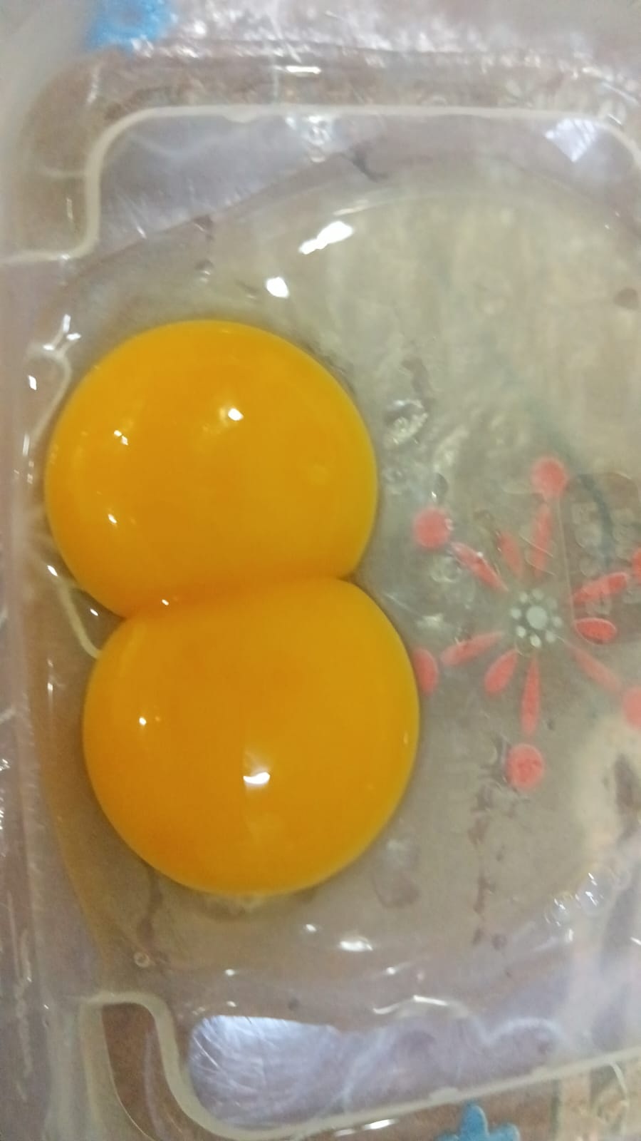 Setelah kembali ke rumah dan hendak memasak telur, saya kagum dan rasa bertuah apabila sebiji telur yang saya pecahkan memilik dua kuning telur kembar.