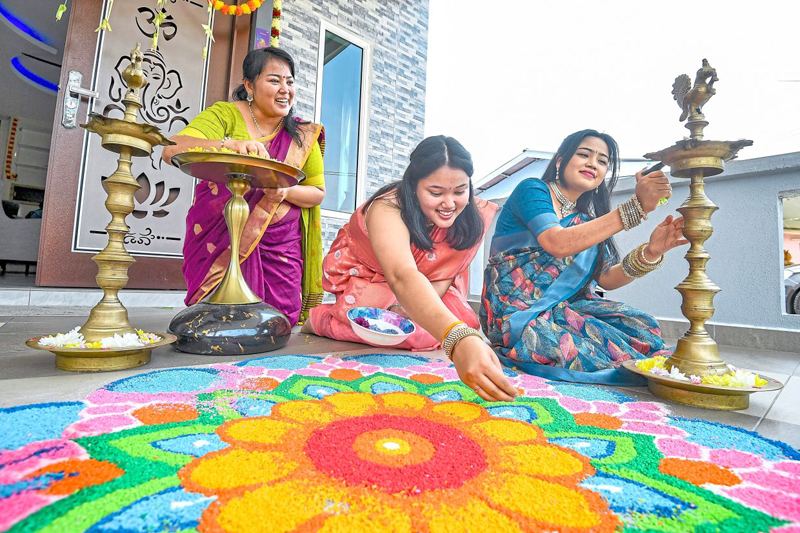 Di anjung pula, adik Santhi, suri rumah S. Kalarani, 46, memberikan sentuhan terakhir pada kolam, bentuk seni tradisional India yang dicipta dengan melukis corak rumit di atas tanah menggunakan beras berwarna.