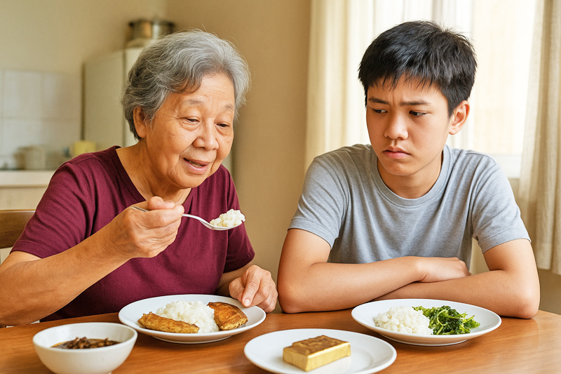 Tapi saya, saya tidak makan. Bukan kerana saya tidak lapar, tapi kerana saya rasa geli dengan cara dia masak. Nasi itu kadang-kadang melekat, ikan goreng itu tidak begitu rangup, dan sayur tumisnya ada bau yang pelik bagi saya.