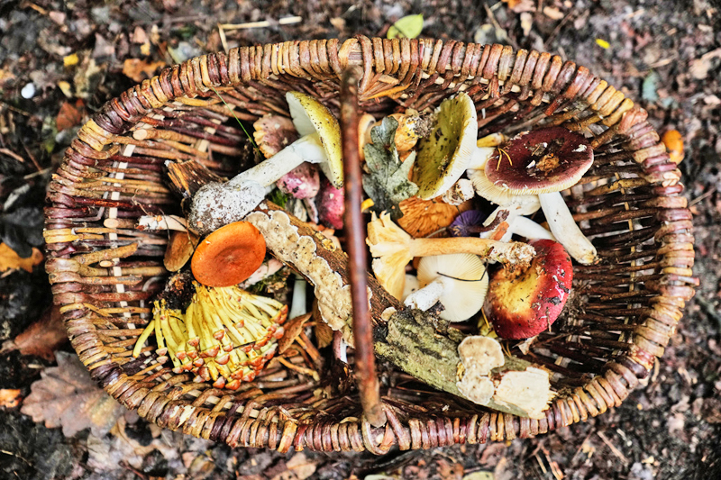 Cendawan porcini dengan payung berwarna coklat dan bay bolete terletak bersebelahan dengan brittlegill ungu serta armillaria berwarna madu bercampur dengan green death cap yang berbahaya.