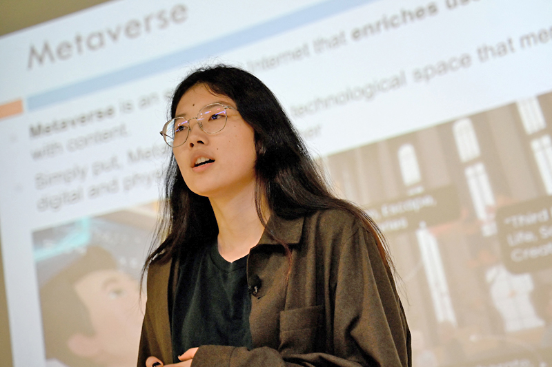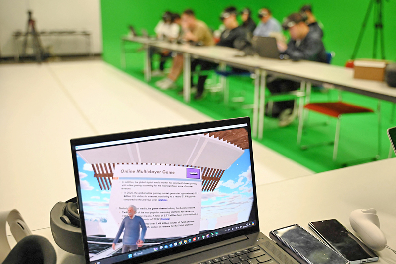 Dalam kursus Media Sosial untuk Kreatif beliau, tenaga pengajar yang dijana AI mengajar 30 orang pelajar lepasan ijazah tentang teknologi imersif dan kesan platform digital.